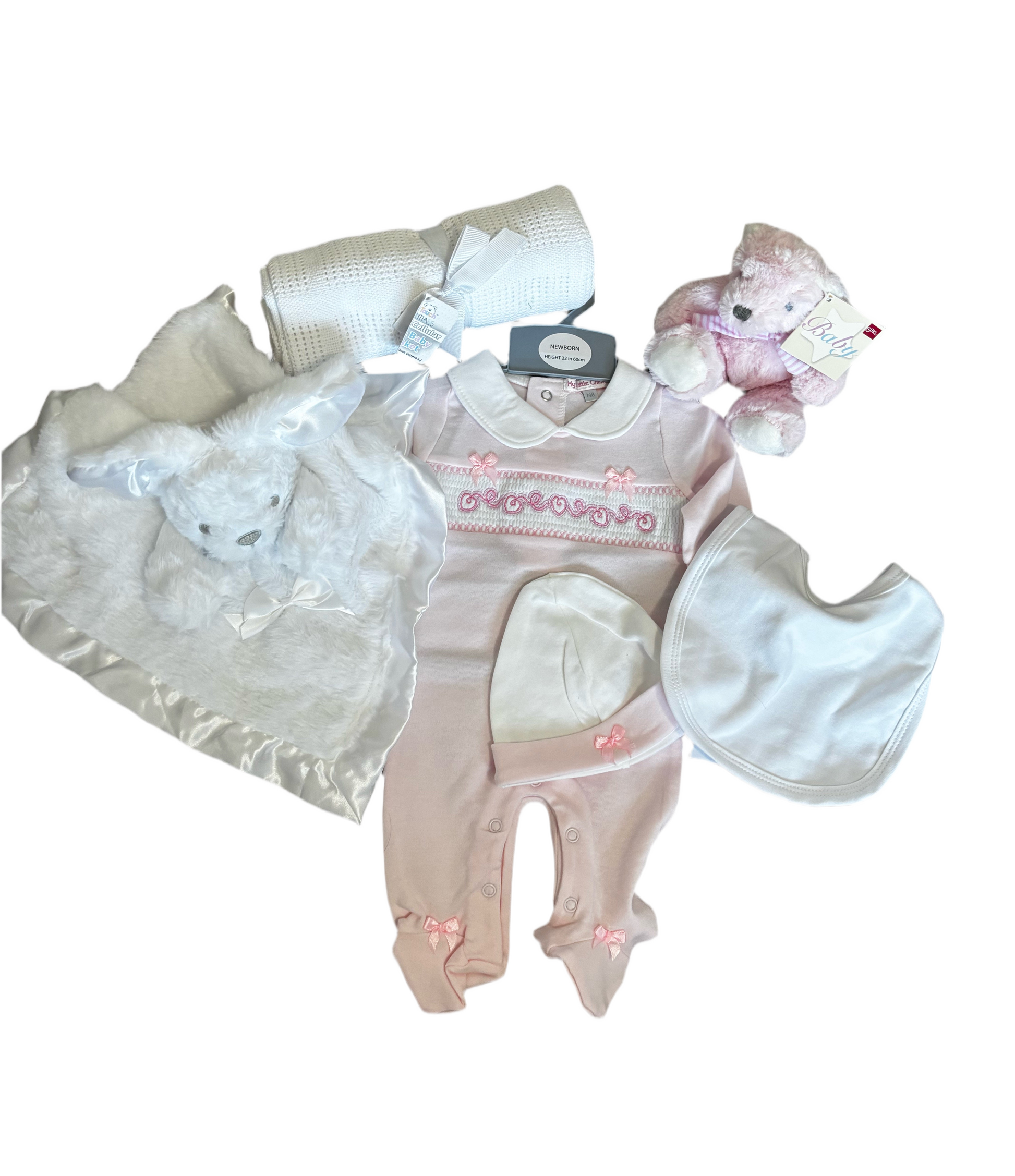 The My Little Chick pink smocked sleepsuit and hat are a must-have for any baby's wardrobe. The sleepsuit is two tone light pink and white with a peterpan collar and embroidered smocked panel paired with a co ord beanie hat. Perfect for parents who want to dress their baby in a cute and stylish outfit that is also practical and comfortable!