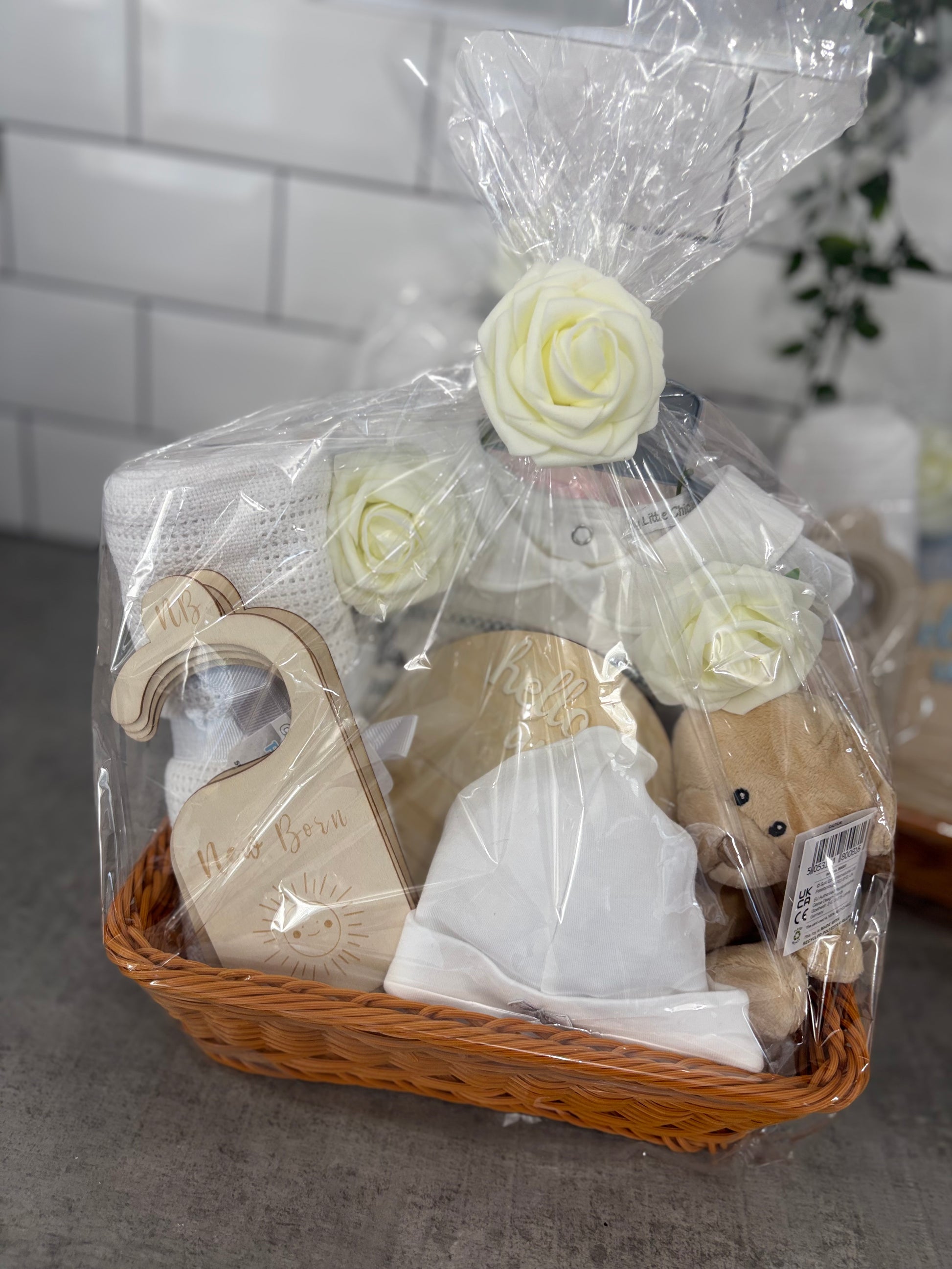 Our smaller new baby hamper in a wicker basket, including the following items: